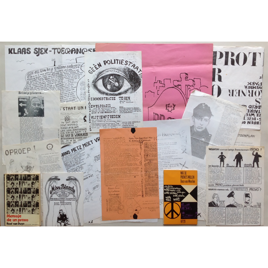 Conjunto formado por 27 documentos: (1) Provokatie no. 5. Provo anarchistenblad. Provo's fietsenplan. Amsterdam, [1965-66?]. Planfleto -(2) Provokatie no. 8. Oproep aan het internationale provotariaat. Provo, anarchistenblad. Amsterdam 1965. Planfleto -(3) Provokatie no. 11. Gemeentelijke Geneeskundige Gezondheidsdienst. Amsterdam 1966. Dos hojas mecanoscritas y grapadas -(4) Provokatie no. 12. Manifest "Aan het Amsterdamse Provotariaat". Amsterdam 1966. Planfleto -(5) Provokatie no. 13. Geen politiestaat. Amsterdam 1966. Planfleto -(6) Provokatie no. 14. Make a Love-War. Amsterdam 1966. Planfleto (en el reverso la Provokatie no. 15) -(7) Provokatie no. 16. Boodschap aan het Amsterdamse Provotariaat. Amsterdam 1966. Planfleto con ilustraciones de Willem (Bernard Holtrop) -(8) Provokatie no. 17. Provo's voor rechter. Amsterdam 1966. Planfleto -(9) In Holland staat un huis. Het Witte Huiz En Plan [Amsterdam 1966]. Planfleto -(10) Oproep! Witte Scholen Plan. [Amsterdam 1966]. Planfleto -(11) Het zal je gebeuren...Goed Dat Er Politie Is. [Amsterdam 1966?]. Pamfleto -(12) Comité De Stempel (Steef van Duin, Bernard de Vries, Duco van Weerlee, André Vink). Amsterdam 1966. Panfleto -(13) Animal warning. Amsterdam 1966. Panfleto -(14) Hans Metz moet vrij! Al dorso: 'Lieve Kerielja door Comandante Ché Guevara'. Amsterdam 1967. Panfleto con ilustraciones de Willem (Bernard Holtrop) -(15) Praktiese richtlijnen bij demonstraties. Amsterdam 1966. Panfleto -(16) Oproep aan alle Amsterdammers. Amsterdam 1966. Panfleto -(17) Waarom stemmen lastige Amsterdammers Provo?. Amsterdam 1966. Panfleto -(18) What is happening? Oproep aan het provotariaat. Witte Bank. Klaas Bank must pay...some day. Amsterdam 1966. Panfleto -(19) Provo-Bulletin War? Spain Nips Anarchists' Plot To Kidnap U.S. Officials. Amsterdam 1966?. Panfleto -(20) Klaas sjek toeranrsbewys. Beter Oorlam dan Oorlog. Klaas Bank must pay some day!. Amsterdam 1967. Póster plegado en 4 -(21) Provo protest meeting. Speakers korner: voorkom de worgdood van Luis Edo, Alicia Mursin, Jesus Rodriques Piney, Antonio Canete, Alberto Dativo, die volgens de Spaanse fascistische politie de Amerikaanse ambassadeur in Spanje... . Amsterdam 1966. Póster plegado en 4 -(22) Miss Blanche en de Van Moppes-diamanten, een moralisties manifest. Roel Van Duyn."Unit", Amsterdam, 1967. Libro -(23) Van Heutz-Van Heutz-Van Heutz ... Neemt allen uw spuitbus rode verf mee!. Weest Wakker en Gewapend. Amsterdam 196?. Planfleto -(24) Provo-Bulletin. Het Amsterdamse Provotariaat verklaart zich unaniem solidair met de eisen van de Amsterdamse Bouwvakarbeiders. Amsterdam 1966. Panfleto -(25) R.I.P. Provo 1965-1967. Hollands Glorie Amsterdam no. 1. Poster de Willem [Bernard Willem Holtrop] -(26) Wat de Provo's Willen. Duco van Weerlee. Uitgeverij de Bezige Bij, Amsterdam, 1933. Libro -(27) Mensaje de un provo. Roel van Duyn. Editorial Fundamentos, Madrid, 1975. Libro