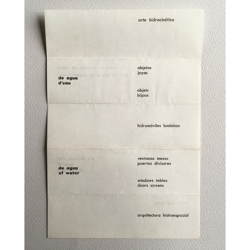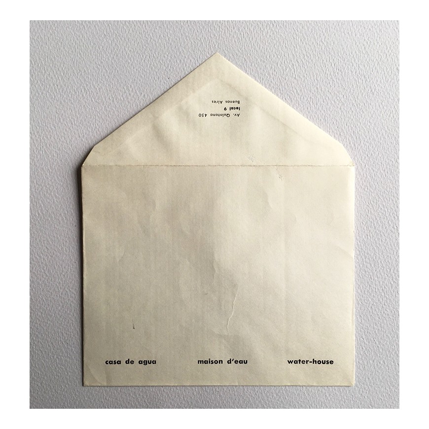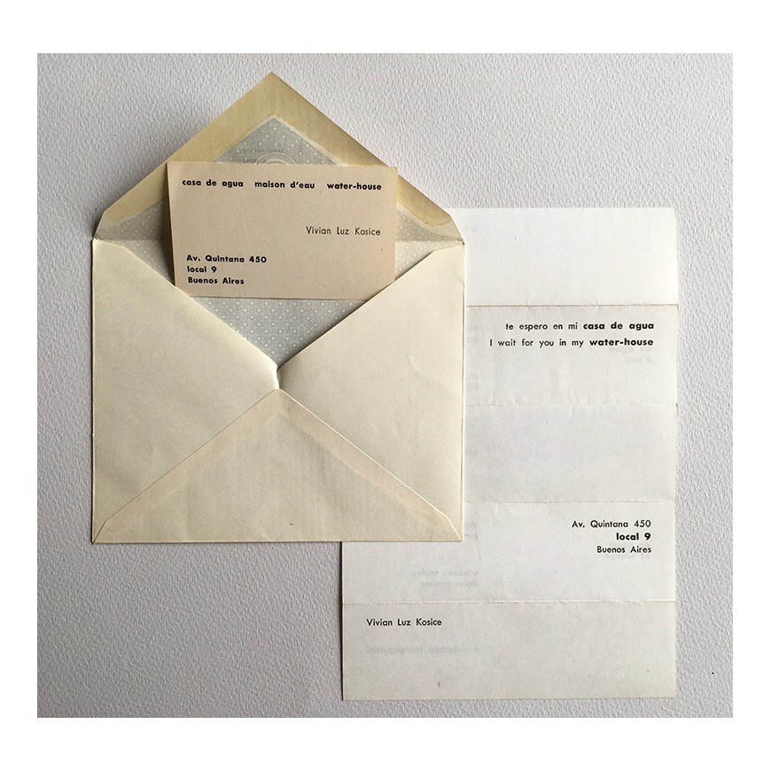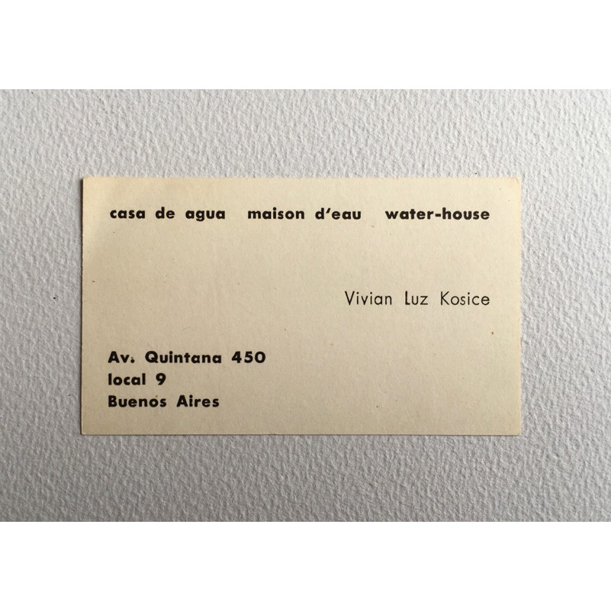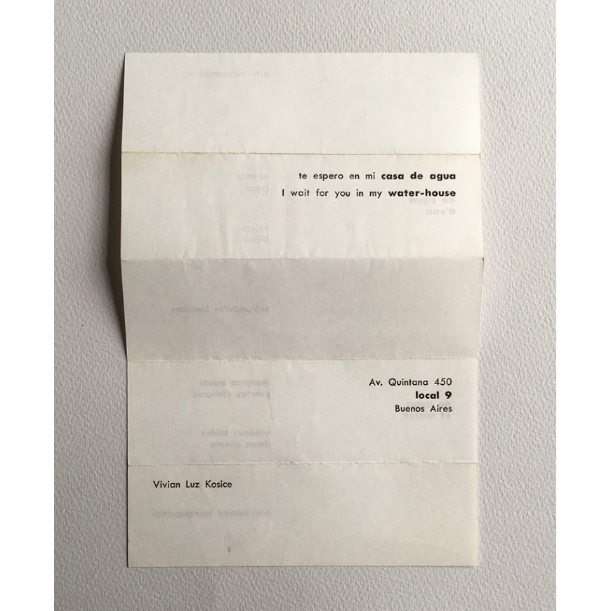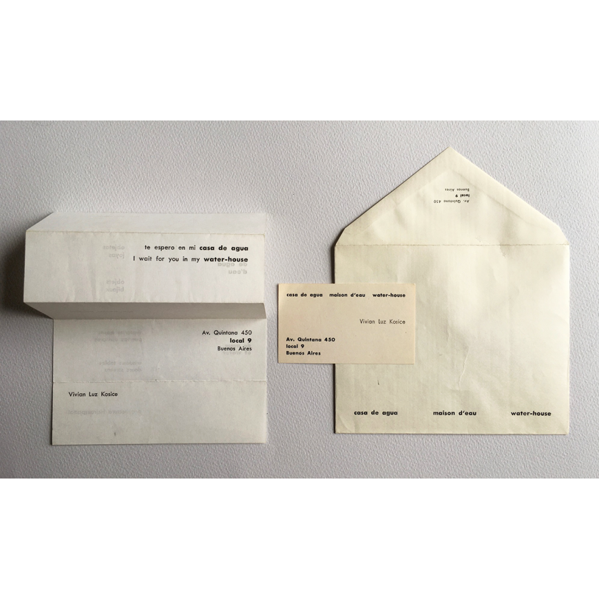 En 1970 la hija mayor de Gyula Kosice, Vivian Luz Kosice, inaugura la tienda Casa de Agua. El espacio ofrecía obras de pequeño formato, todos diseñados por Kosice. La ambientación incluía obras de mayor tamaño. El objetivo era integrar el arte hidrocinético a la vida cotidiana. Ofrecemos aquí un pliego-invitación a la inauguración de la tienda y una tarjeta personal de Vivian Luz Kosice; ambos en sobre original impreso