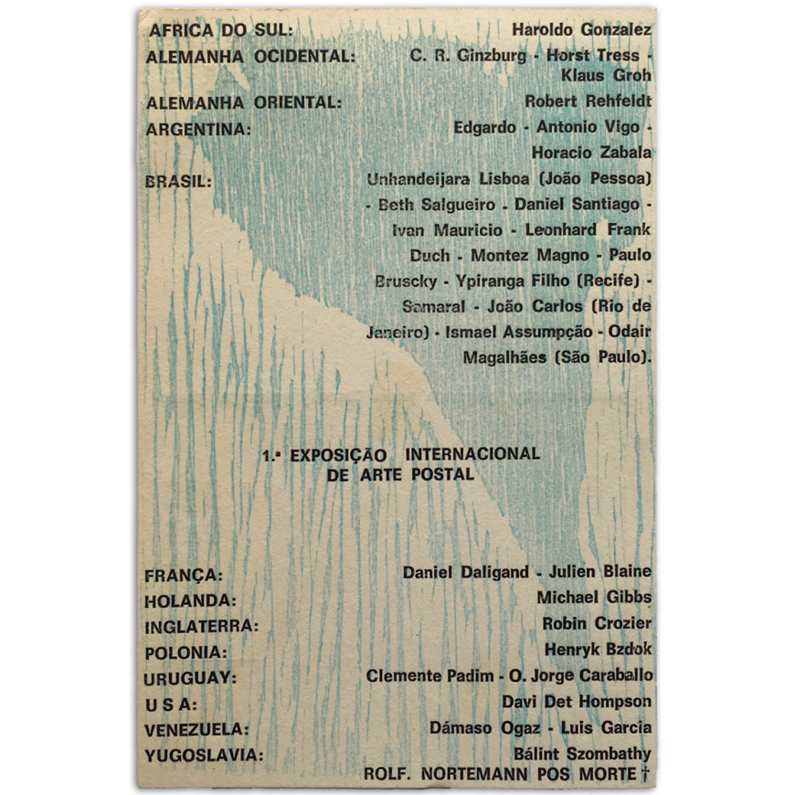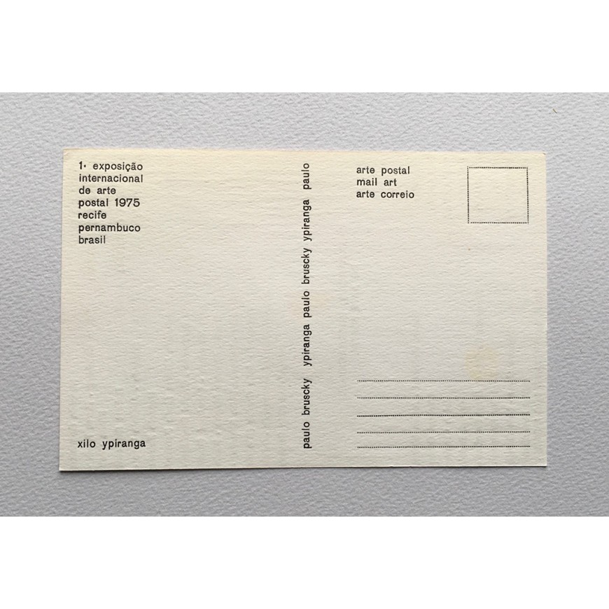 Tarjeta postal con la lista de participantes de la muestra, entre ellos Paulo Bruscky, Ypiranga Filho, Klaus Groh, Robert Rehfeldt, Edgardo-Antonio Vigo, Horacio Zabala, Daniel Santiago, Leonhard Frank Duch, Samaral, Julien Blaine, Robin Crozier, Michael Gibbs, Clemente Padín, Jorge Caraballo, Dámaso Ogaz, etc. Ilustrada con una xilografía de Ypiranga