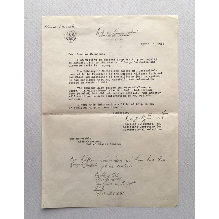 Adjunta fotocopia de la carta de Douglas J. Bennet, Jr. (Assistant Secretary for Congressional Relations) al senador norteamericano Alan Cranston en respuesta a la consulta de este último sobre la situación de Jorge Caraballo y Clemente Padín en Uruguay. La carta está fechada en Washington - Department of State - el 3 de abril de 1979. Finalmente, en una nota manuscrita al pie, se remite a Geoffrey Cook para obtener más información sobre la situación (Geoffrey Cook fue uno de los principales organizadores de la protesta de la red de arte postal pidiendo la liberación de los poetas uruguayos Clemente Padín y Jorge Caraballo). También hay dos notas manuscritas en la parte superior: "Please circulate" y "Art as Communication!"