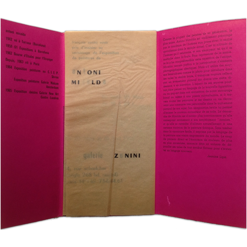 Catálogo de la exposición: pliego de 3 hojas en papel vegetal. En portafolio ilustrado con fotografía de Peter Knapp y con texto impreso de Jeanini Lipsi (en francés)