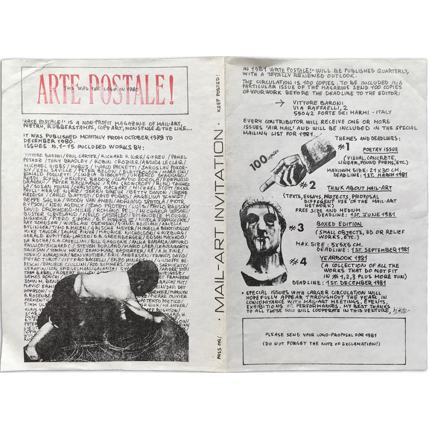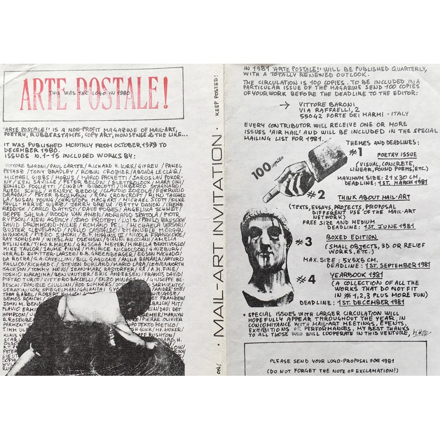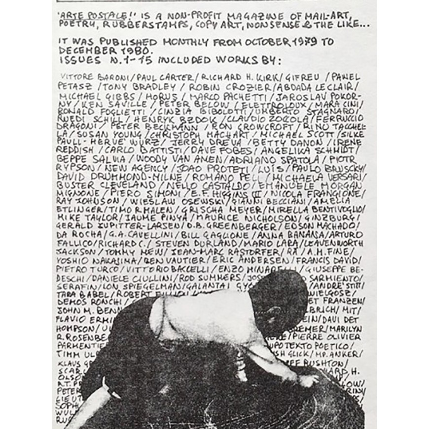 "Arte Postale! is a non-profit magazine of mail-art, poetry, rubberstamps, copy art, nonsense & the like... . It was published monthly from october 1979 to december 1980... . In 1981 Arte Postale! will be published quarterly, with a totally renewed outlook"