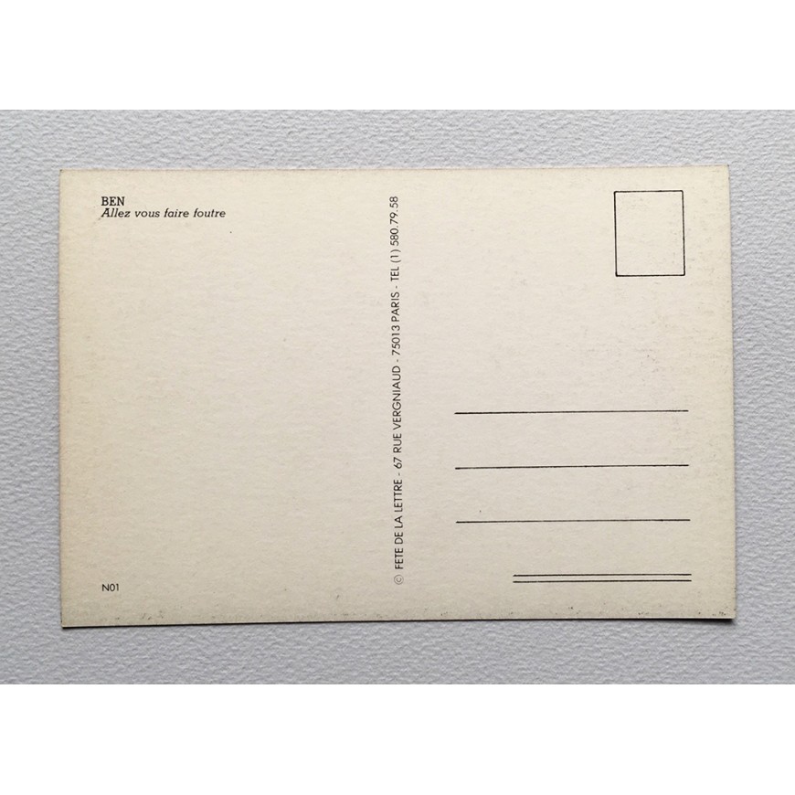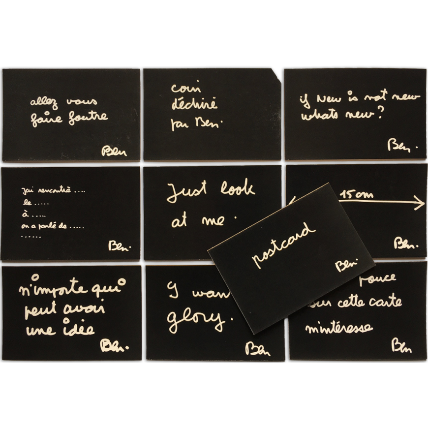 Conjunto de 10 postales del artista perteneciente al movimiento Fluxus Ben Vautier impresas, blanco sobre negro, con algunos de sus aforismos. Numeradas correlativamente al dorso del 1 al 12 (excepto el 2 y el 3)