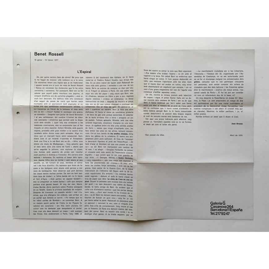 Díptico de la exposición con reproducción en b/n. Con el texto de Joan Brossa "L'Espiral" (en catalán). Plegado en tres