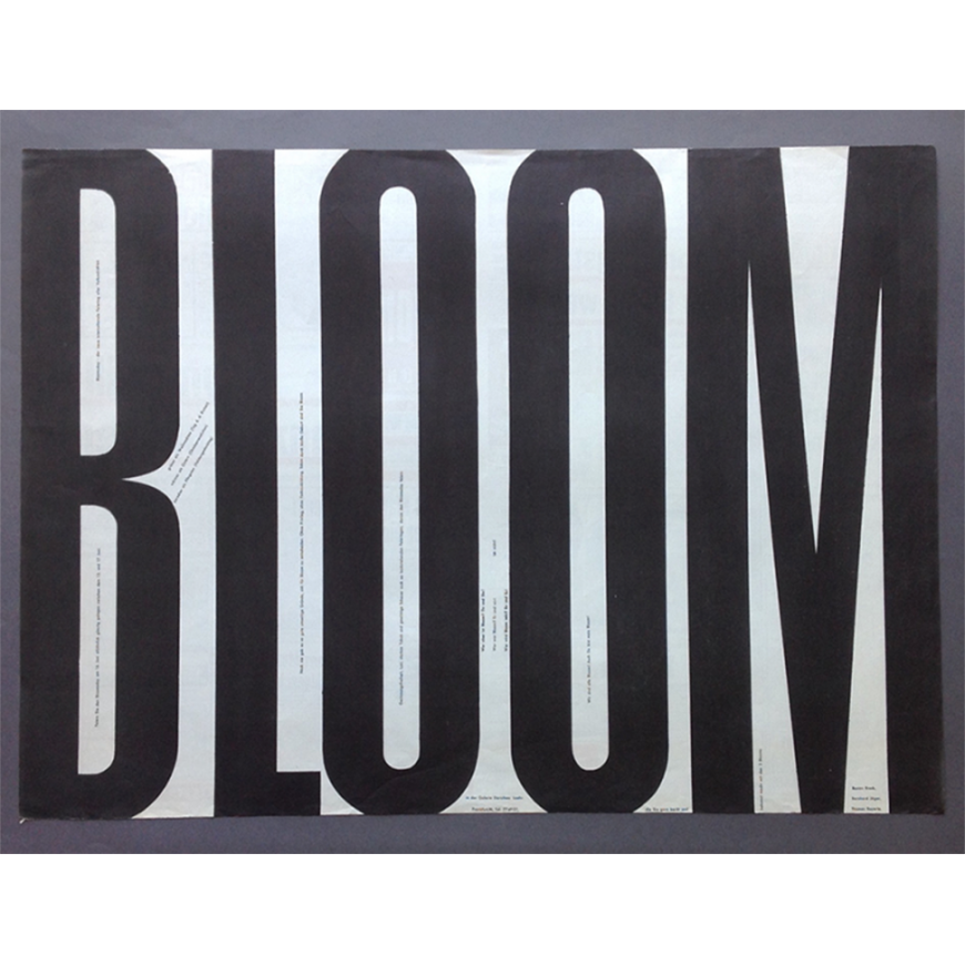 Gran hoja suelta, sin plegar, e ilustrada con numerosas fotografías. Impresa en rojo y negro por una cara y en el reverso con la palabra "BLOOM" en grandes letras a modo de póster. Buen estado