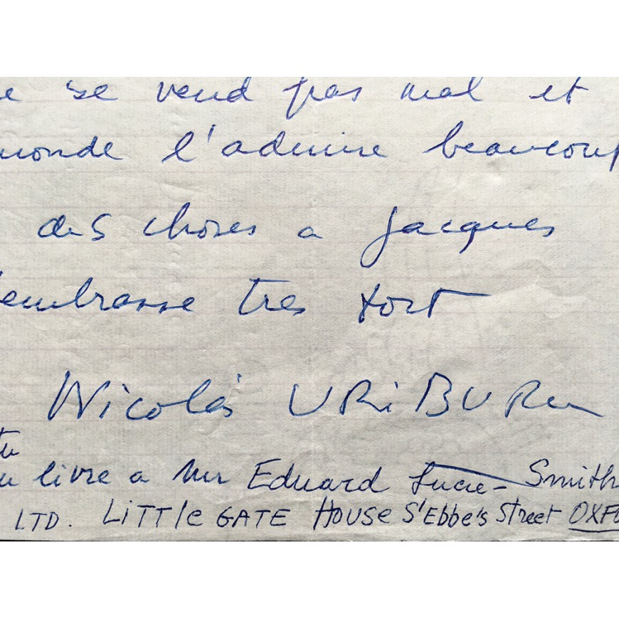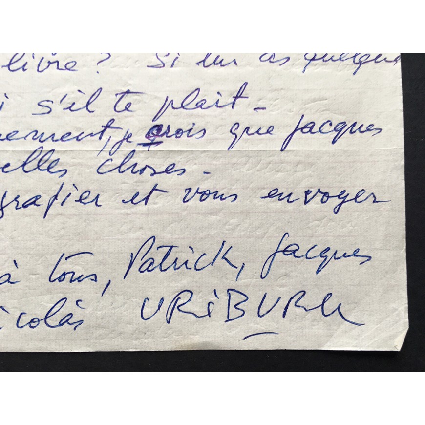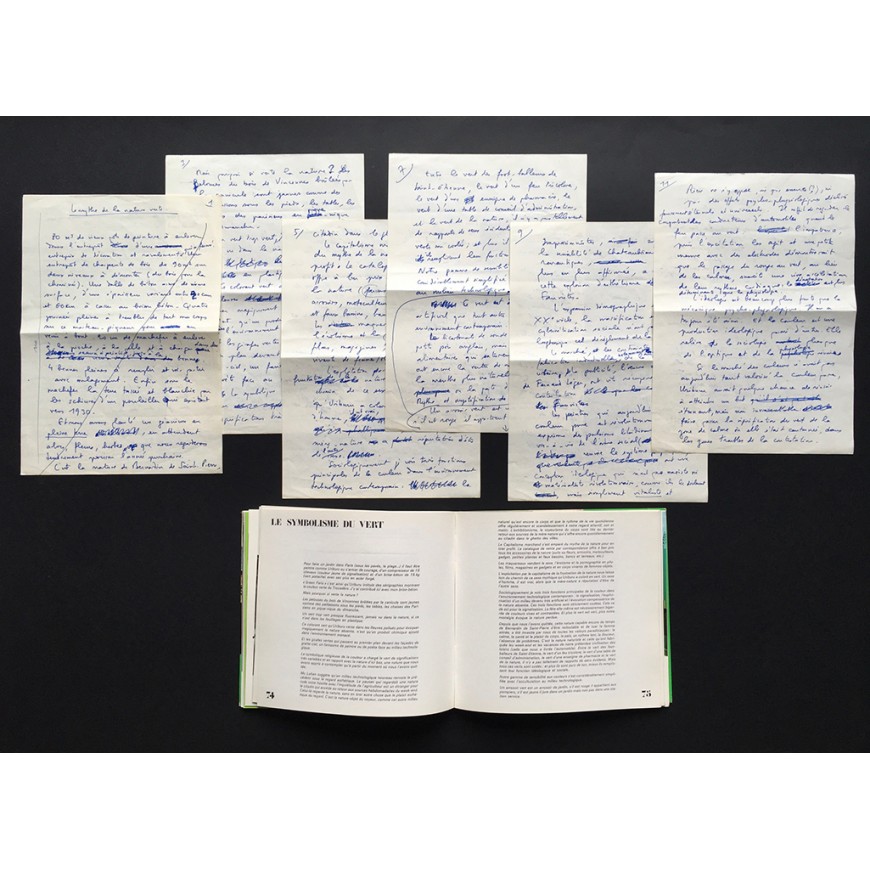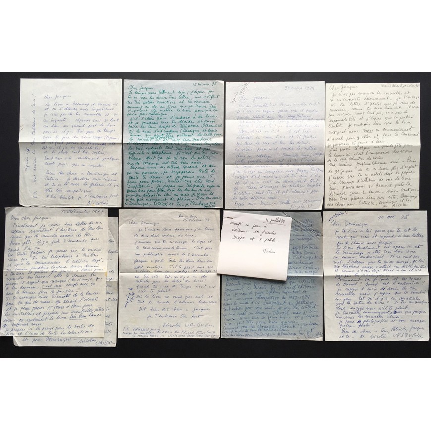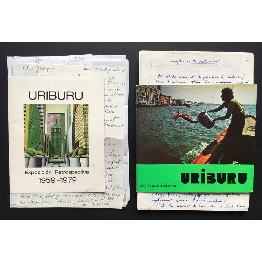 Conjunto documental compuesto por 8 cartas manuscritas de Nicolás García Uriburu dirigidas al editor Jacques Damase y a su colaborador Dominique (en total 9 folios escritos por una cara). En francés y firmadas al final por Uriburu. Fechadas entre diciembre de 1977 y julio de 1979, y relativas al libro en preparación "Uriburu Coloration 1968-1978" (del que adjuntamos un ejemplar). El conjunto incluye el texto manuscrito de la introducción de Hervé Fischer "Le Mythe de la nature verte" (6 folios manuscritos por ambas caras, firmado por Fischer al final y fechado en junio de 1976). Finalmente se incluye el catálogo de la muestra "Uriburu - Exposición Retrospectiva 1959-1979", que tuvo lugar en las Salas Nacionales de Exposiciones en Buenos Aires en 1979