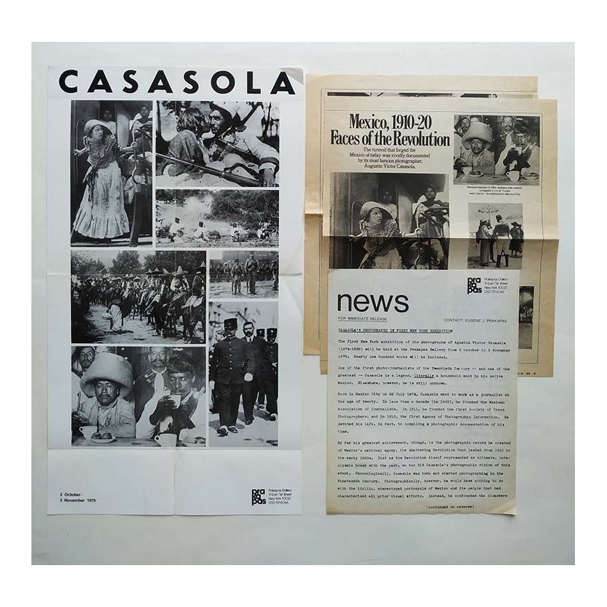Folleto plegado de la exposición de fotografías de la Revolución mexicana del fotógrafo mexicano Agustín Víctor Casasola. Impreso por ambas caras e ilustrado con algunas de las fotografías que se expusieron. Se adjunta hoja suelta de la galería con información sobra la exposición - "Casasola's photographs in first New York exhibition" - también impresa por ambas caras. Igualmente adjuntamos 2 hojas de The New York Times Magazine con la reseña que publicó sobre la exposición