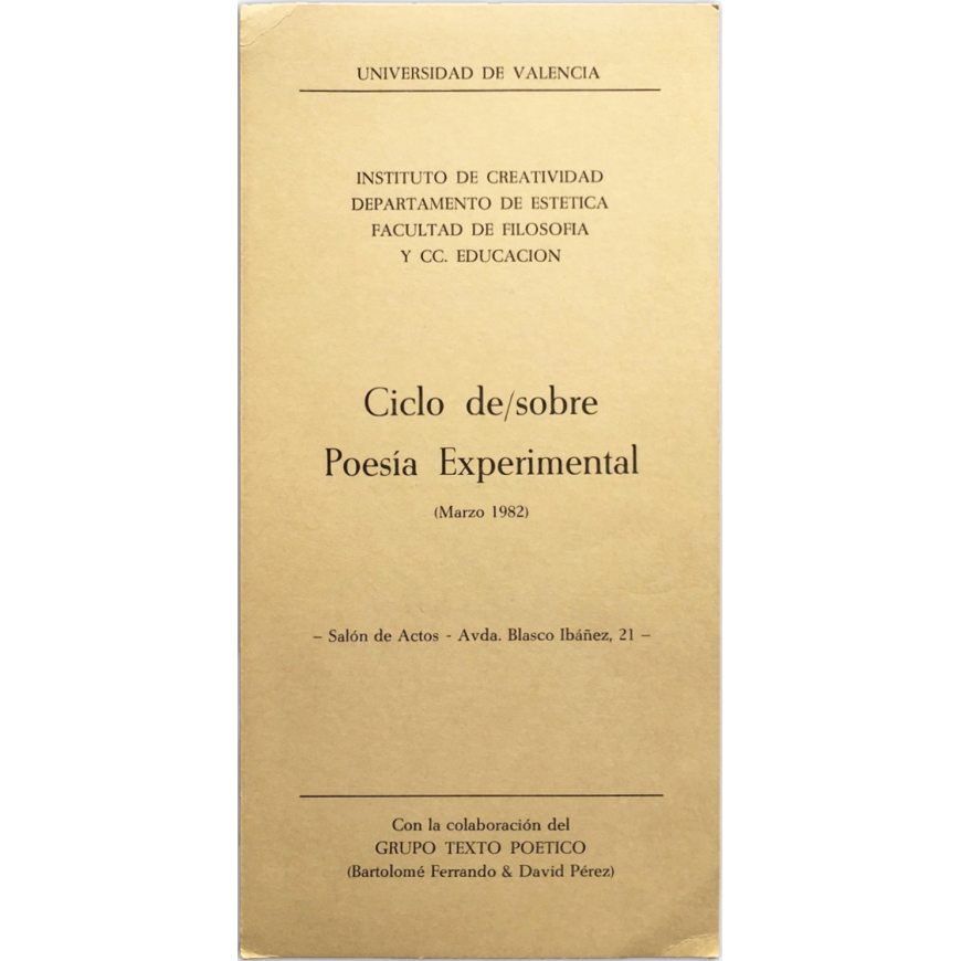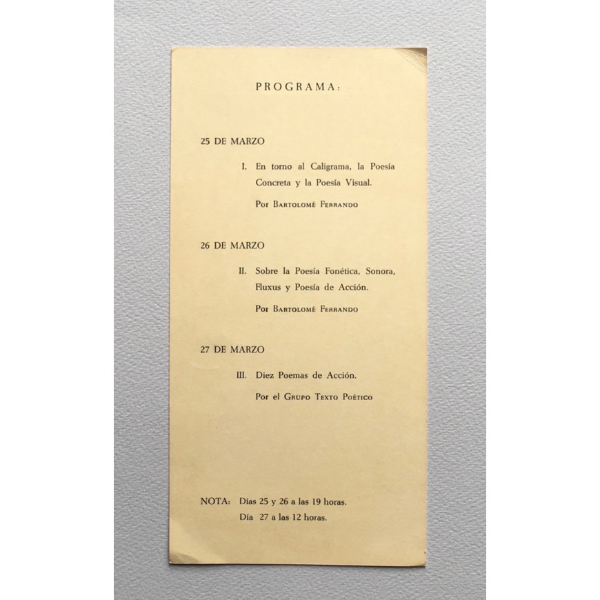 Programa del evento que se llevó a cabo con la colaboración del Grupo Texto Poético, integrado por Bartolomé Ferrando y David Pérez. En el programa el Caligrama, la Poesía Concreta, la Poesía Visual, la Poesía Fonética, Sonora, Fluxus y la Poesía de Acción por Bartolomé Ferrando. Además se presentaron Diez Poemas de Acción del Grupo Texto Poético. Tarjeta impresa por ambas caras