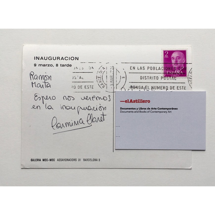 Tarjeta-invitación a la exposición. Manuscrita en reverso con los datos del destinatario. Sello postal y matasellos