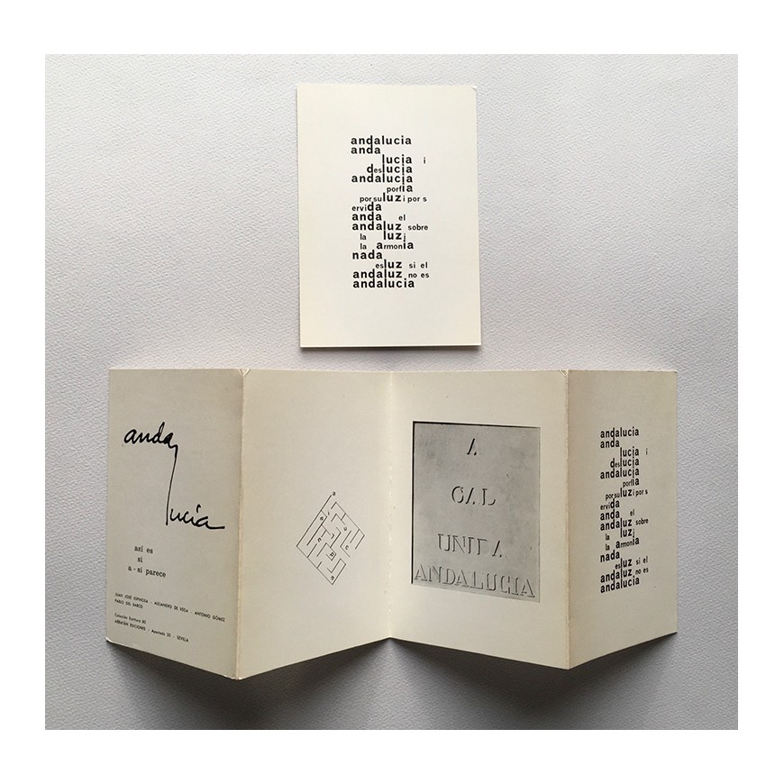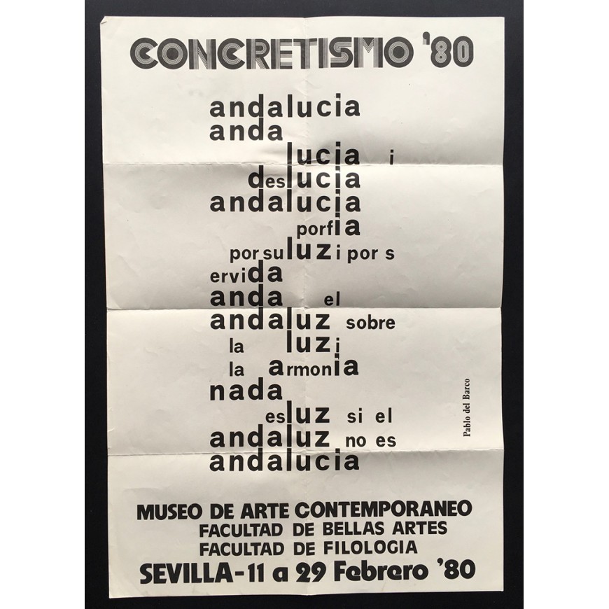 Se adjunta tarjeta de la muestra con poema visual de Pablo del Barco: "Andalucía concreta", 1980 (Euskal Bidea Ediciones - Colección "Nueva Escritura") + pliego de 4 hojas en acordeón diseño también de Pablo del Barco para la exposición