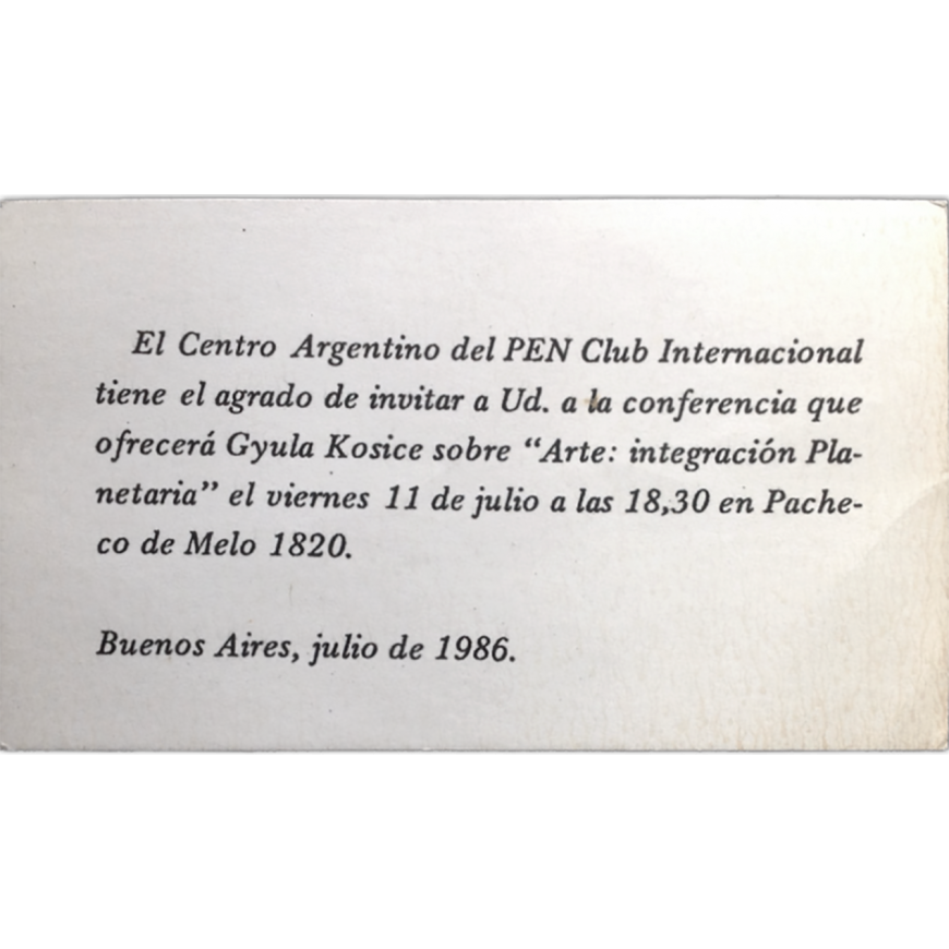 "El Centro Argentino del PEN Club Internacional tiene el agrado de invitar a Ud. a la conferencia que ofrecerá Gyula Kosice sobre "Arte: integración Planetaria" el viernes 11 de julio a las 18,30 en Pacheco de Melo 1820. Buenos Aires, julio de 1986"