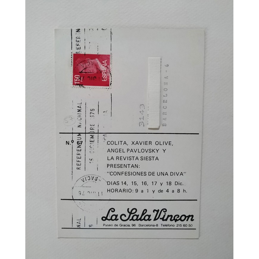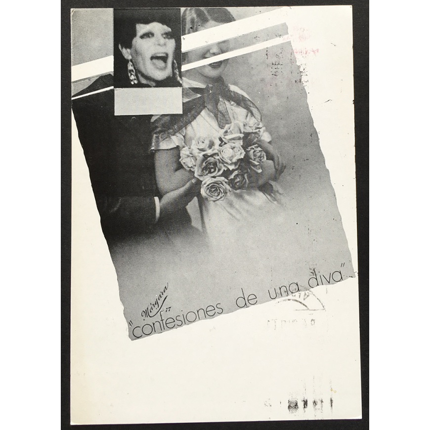Tarjeta-invitación a la exposición. Con los datos del destinatario y matasellada. (La persona que servirá de modelo para Colita en ese proyecto, "Confesiones de una diva", será el transformista Ángel Pavlovsky)