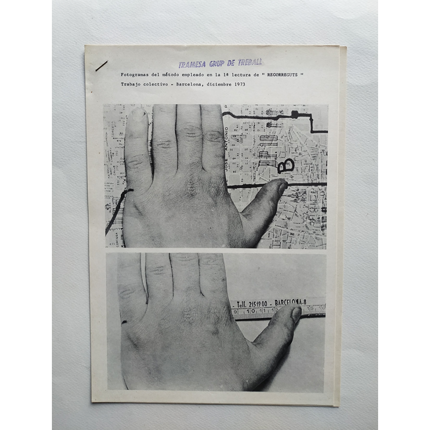 Conjunto compuesto por 5 documentos: 1- [Document-resposta a Tàpies] 5 hojas mecanoscritas con el texto del Colectivo Conceptual en respuesta al artículo de Antoni Tàpies titulado "La creación - Arte conceptual aquí", aparecido en el periódico La Vanguardia el 14 de marzo de 1973. El documento está fechado el 1 de mayo de 1973 y termina con la lista de todos los firmantes (F. Abad, A. Abril, J. Benito, M. Bosch, M. A. Companys, A. Corazón, M. Cuñat, R. Figueras, A. Fingenhurt, J. Garay, F. Gison, G. Hernández, E. Ibáñez, S. Marchán, A. Mercader, J. Morera, A. Muntadas, C. Pazos, Ll. Pau, O. L. Pijuan, P. Portabella, M. Robira, E. Sales, J. Sans, C. Santos, D. Selz, Ll. Utrilla, P. S. Ventura y R. Villas). Esta respuesta fue enviada al mismo periódico pero nunca fue publicada. El texto sería finalmente publicado en la Revista Nueva Lente en 1973 / 2- Tarragona, Informació d'art 1973 - Grup de Treball: Abad, Benito, Fingerhut, Julián, Mercader, Muntadas, Ribé, Rovira, Sales, Santos, Selz i Torres. Llibreria de la Rambla, Tarragona del 17 al 25 de Novembre de 1973. Catálogo compuesto por 5 hojas mecanoscritas en carpeta original impresa / 3- Terrassa, Informació d'art 1973 - Grup de Treball: Abad, Benito, Corazón, Fingerhut, Julián, Marchán, Mercader, Muntadas, Ribé, Rovira, Sales, Santos, Selz i Torres. Institut Industrial, Terrassa, 1-15 desembre 1973. Cartel de la exposición / 4- Tramesa Grup de Treball. Fotogramas del método empleado en la 1ª, 2ª y 3ª lectura de "RECORREGUTS". Trabajo colectivo - Barcelona, diciembre 1973. 3 hojas grapadas con ilustraciones en b/n / 5- Qüestions d'art. La revista catalana d'art actual. Any V. Nº 28. BUSQUETS, Pere - Joan Vila Grau (Directores). Grafesa, Barcelona, 1974. Ilustraciones en b/n. Editorial de Daniel Giralt-Miracle. Textos de Alexandre Cirici, Valeriano Bozal, Marchán Fiz, Arnau Puig y otros. Número dedicado al Grup de Treball (F. Abad, J. Benito, J. Carbó, A. Fingerhut, X. Franquesa, C. Hac Mor, I. Julián, A. Mercader A. Munné; A. Muntadas, J. Parera, S. Pau, P. Portabella À. Ribé, M. Rovira, E. Sales, C. Santos, D. Selz, F. Torres, M. Costa)