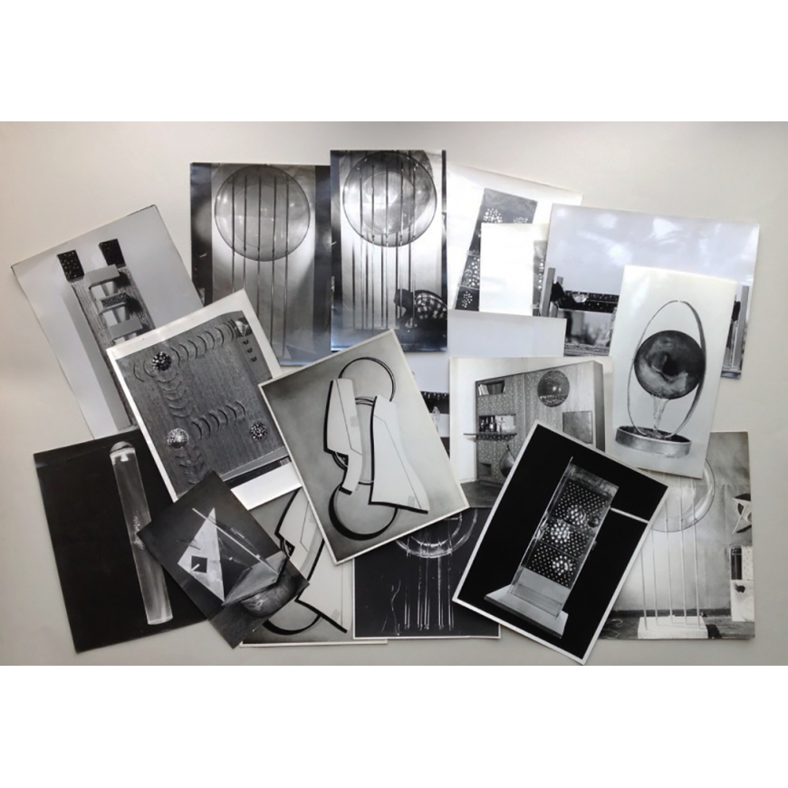Conjunto de 17 fotografías en b/n de diferentes obras de Gyula Kosice, 2 de ellas duplicadas. 3 con el sello del fotógrafo Pedro Roth y 2 manuscritas por Kosice en reverso con el título de la obra fotografiada y su firma. Diferentes tamaños