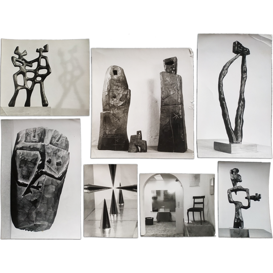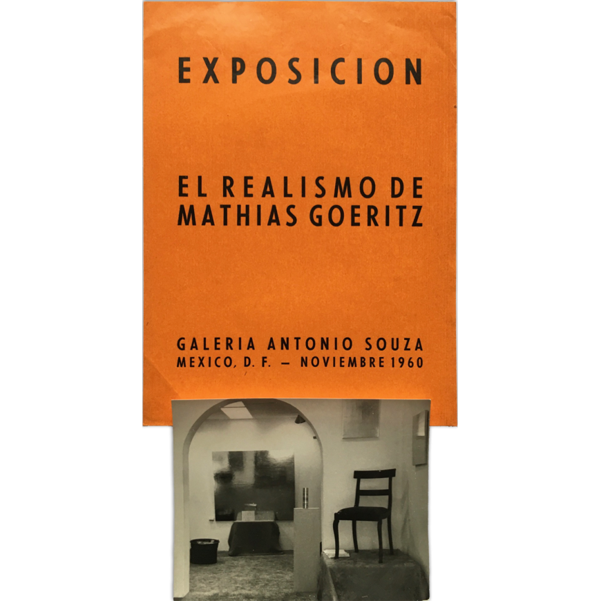 Conjunto de 7 fotografías de esculturas de Mathias Goeritz, todas ellas copias de época. La primera, "Sleeping couple" (1955), anotada por el propio Goeritz en reverso. Las dos siguientes son fotos de Marianne Goeritz y llevan su sello en el reverso (una de ellas con pequeñas pérdidas en uno de los bordes). La cuarta también está sellada por el fotógrafo, Fernando González Barba. La quinta es de la exposición "El realismo de Mathias Goeritz", celebrada en la Galería Antonio Souza de México en noviembre de 1960 y adjuntamos la invitación (en esta exposición se presentó el manifiesto "Estoy harto", en el que Goeritz critica el arte de la basura o lo que el llama "arte mierda"). La sexta en una fotografía de su escultura "Mendigo" (1953). Y la séptima es de la fotógrafa Kati Horna y lleva su sello (salvo una pequeña rotura en un borde en muy buen estado)