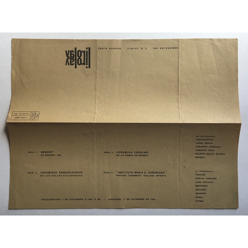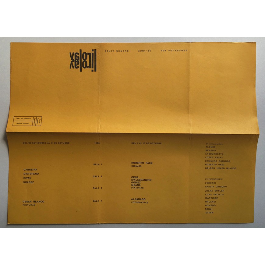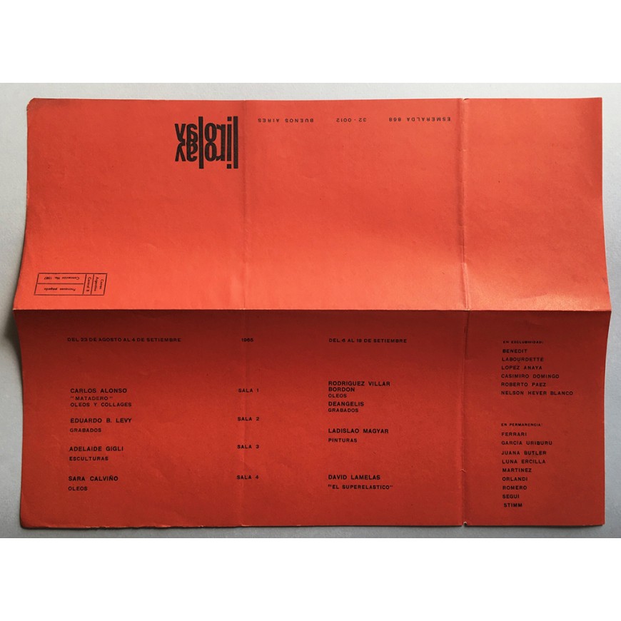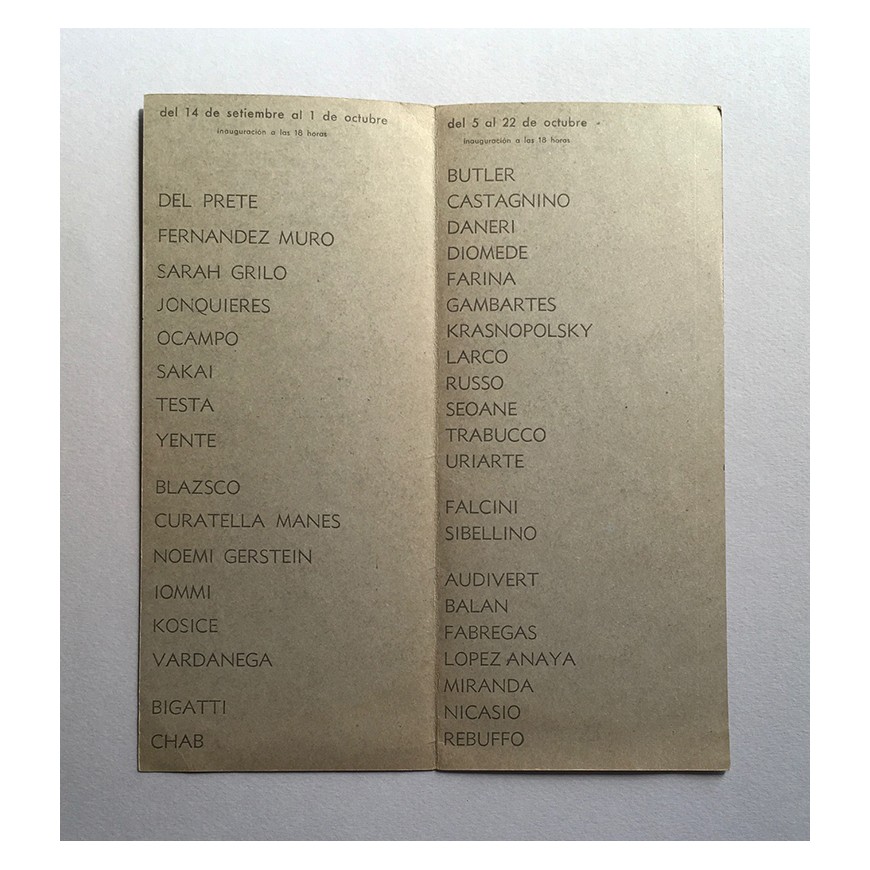 - 25 programas de exposiciones programadas por la galería entre diciembre de 1964 y noviembre de 1971 (Grabado, Pintura, Escultura, Dibujos, Fotografías, Collages, Tapices, Céramicas arqueológicas, Cerámica Popular,...). Entre los artistas que expusieron sus obras: Juan Carlos Romero, Luna Ercilla, Alicia Orlandi, Berni, Squirru, Carmen Hamel, Benedit, Nelson Blanco, César Ambrossini, Óscar Brandán, David Lamelas, Distéfano, Mara Sánchez, Seguí, Delia del Carril, Grupo Arte Nuevo (Perú), Óscar César Mara, José Luis Alexanco, Masao Kataoka, Alicia Ferrari, Graciela Gutiérrez Marx, José Luis Perotta, Carlos Uría, Juan Carlos Meana, Amalia Cassullo, Osvaldo Palladino, "Fotografía Nueva Imagen" por Movimiento de Grupos Fotográficos, Norberto Onofrio, Lucio R. Loubet, Cristino Alonso, Frida Nemirovsky, Grupo Beta, Gloria Priotti, Kenneth Kemble y muchos otros. Cinco de ellos con inscripciones a bolígrafo