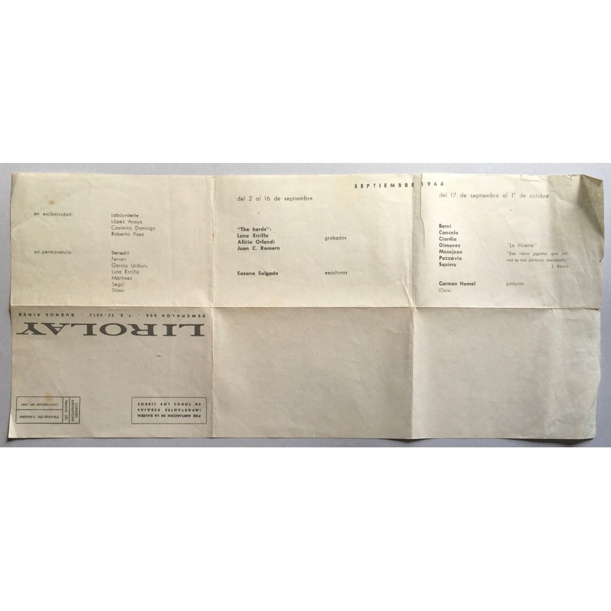 Conjunto documental de la Galería Lirolay de Buenos Aires. En total 45 documentos (programas, carteles e invitaciones) que abarcan un período que va de 1960 a 1973.