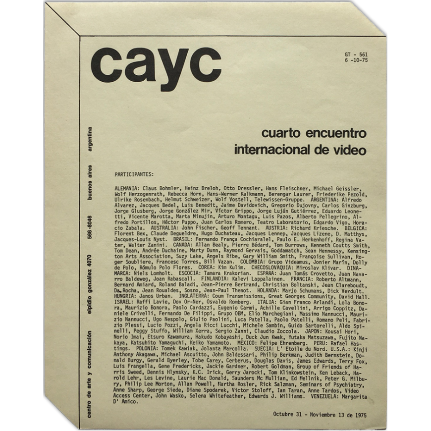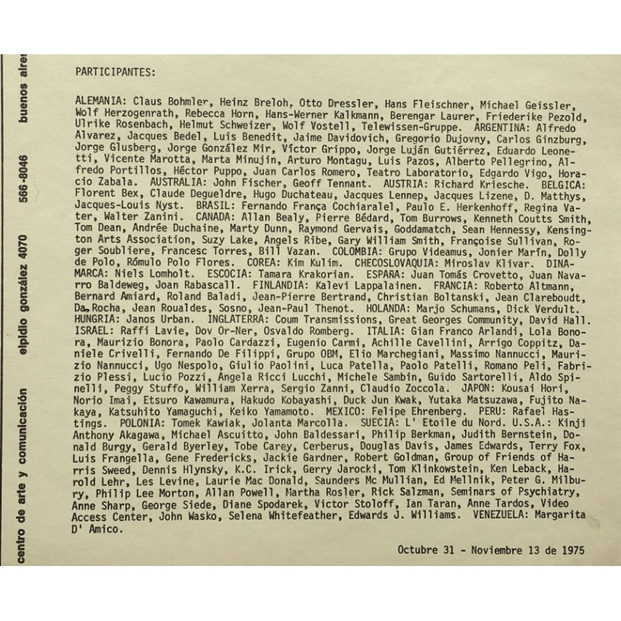 Gacetilla informativa del CAyC (GT-561; 6-10-75) con la lista de participantes, entre ellos: Wolf Vostell, Jaime Davidovich, Marta Minujin, Víctor Grippo, Luis Pazos, Juan Carlos Romero, Edgardo Antonio Vigo, Horacio Zabala, Otto Dressler, Jonier Marín, Francesc Torres, Juan Navarro Baldeweg, Joan Rabascall, Roberto Altmann, Christian Boltanski, Janos Urban, Coum Transmissions, Maurzio Nannucci, Kobayashi, Keiko Yamamoto, Felipe Ehrenberg, John Baldessari, Martha Rosler, Àngels Ribé, Teatro Laboratorio, Walter Zanini, Fernando França Cochiaralel, Tom Borrows, Roland Baladi, Da Rocha, Osvando Romberg y muchos otros