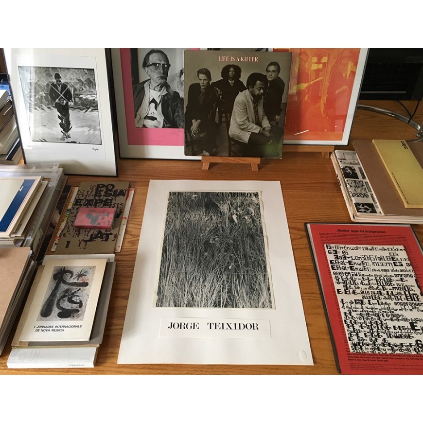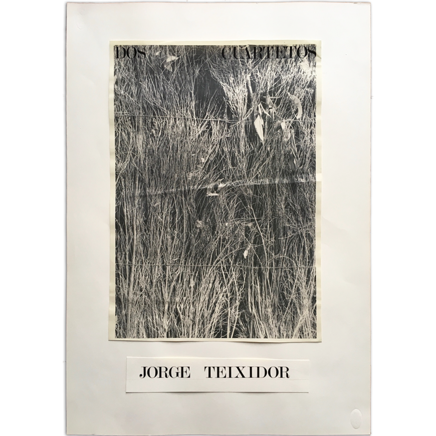 Maqueta de cartel para una exposición del artista valenciano Jordi Teixidor (posiblemente la que tuvo lugar en la Galería Juana de Aizpuru de Sevilla en 1977). Con una fotografía en b/n y el nombre del artista impresos sobre papel y sobrepuestos sobre cartulina blanca
