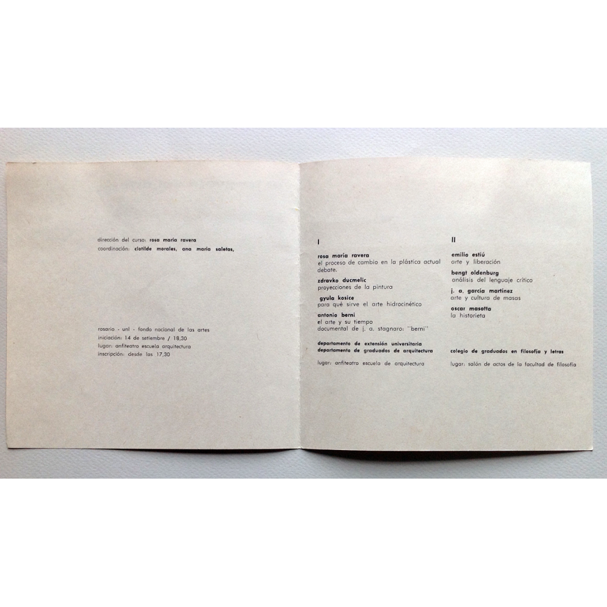 Dirección del curso: Rosa María Ravera. Los ponentes: R. M.ª Ravera, Z. Ducmelic, Gyula Kosice, Antonio Berni, Emilio Estiú, Bengt Oldenburg, J. A. García Martínez y Oscar Masotta (La historieta)