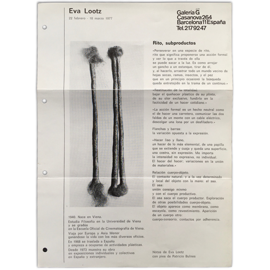 Eva Lootz. Galería G, Barcelona, 22 febrero - 18 marzo 1977