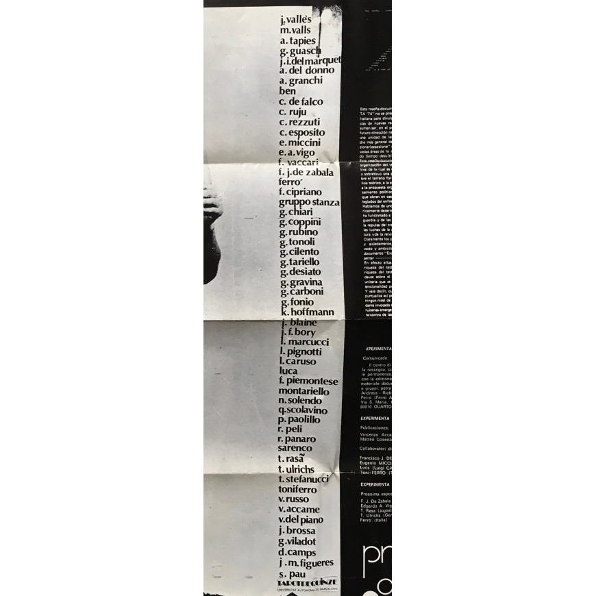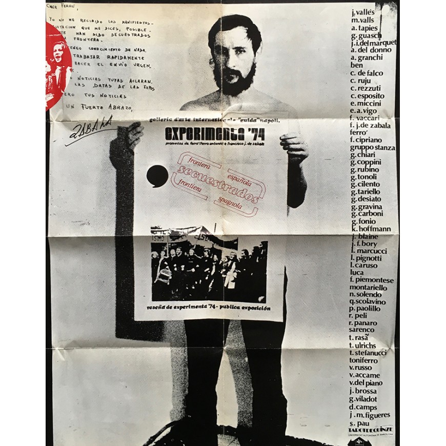 Cartel de la exposición promovida por Antonio Ferro y el poeta experimental español Francisco J. de Zabala [Francisco Zabala]. Con texto de Luigi Castellano (en italiano, francés y español) y lista de los artistas que participaron en la muestra, entre ellos, Edgardo-Antonio Vigo, Joan Brossa, Antoni Tàpies, Guillem Viladot, Josep Maria Figueres, Tarot de quinze, Julien Blaine, J. F. Bory, Timm Ulrichs, Manel Valls, Iglésias del Marquet, Francisco Zabala, Gruppo Stanza, Sarenco, Eugenio Miccini, Vincenzo Accame y muchos otros. Leves desgastes (uno de ellos con pérdida de papel), pequeñas pérdidas en bordes y dos roturas en las marcas de doblez, por lo demás correcto estado. Plegado