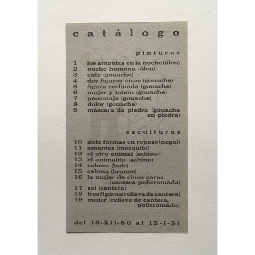 Folleto de la exposición que se inauguró del 14 de Enero de 1950 en Guadalajara, México. Impreso por ambas caras y con la lista de obras expuestas (pinturas y esculturas)