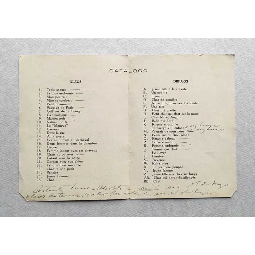 Catálogo-díptico de la muestra con la lista de todas las obras expuestas, más de 50 incluyendo óleos y dibujos. Pérdida en dos esquinas y anotaciones a tinta. En francés