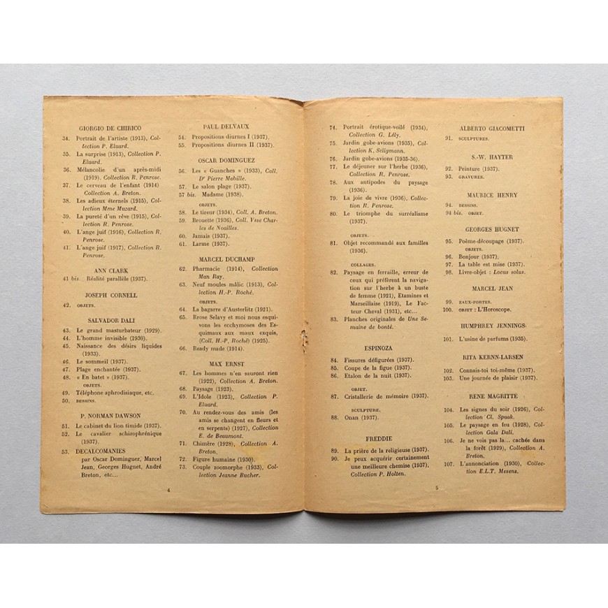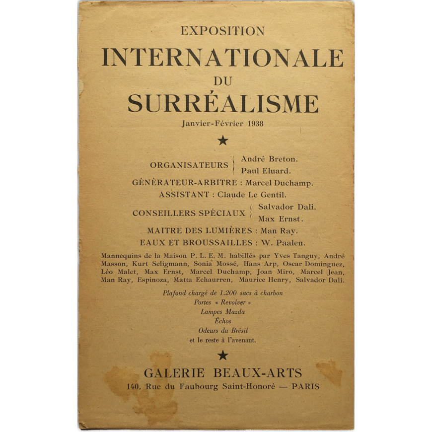 Programa de mano de la exposición. Entre Enero y Febrero de 1938 se realiza esta exposición en la Galerie Beaux-Arts, en el nº 140 de Rue du Faubourg Saint-Honoré de París, propiedad de Georges Wildenstein. Organizada por Breton y Eluard, supervisada por Marcel Duchamp, con sugerencias técnicas de Salvador Dalí y Max Ernst, iluminación de Man Ray y colaboraciones de Georges Hugnet y Wolfgang Paalen. Participan 60 artistas de 14 países y se exponen 229 objetos, todo lo cual está detallado en el documento