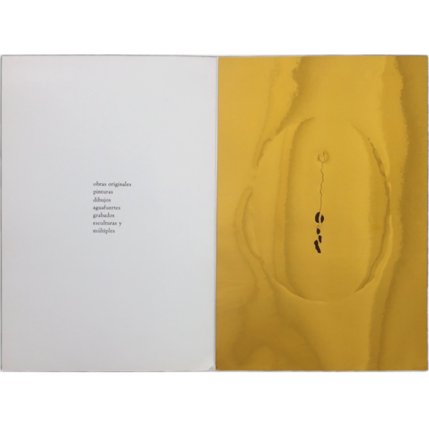 Invitación a la exposición "Fontana. Obras originales, pinturas, dibujos, aguafuertes, grabados, escultura y múltiples". De la serie "Presencias de nuestro tiempo". Díptico con lámina sobrepuesta en su interior. La lámina es dorada en el anverso y plateada en el reverso y está agujereada en el centro