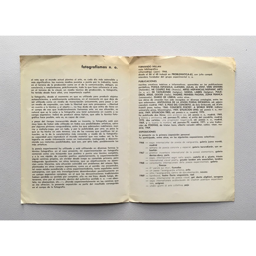 Díptico de la exposición con un texto del artista ("Fotografismos n.o.") y la relación de sus publicaciones, exposiciones y grabaciones. Dos pequeñas roturas en el borde superior, por lo demás buen estado