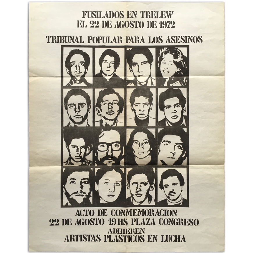 "Fusilados en Trelew el 22 de agosto de 1972. Tribunal popular para los asesinos. Acto de conmemoración 22 de agosto 19hs Plaza Congreso. Adhieren Artistas Plásticos en Lucha"