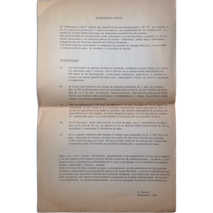 Hoja suelta impresa por una cara con la descripción de la obra. Fechado en diciembre de 1966 ("G. Kosice. Diciembre 1966")