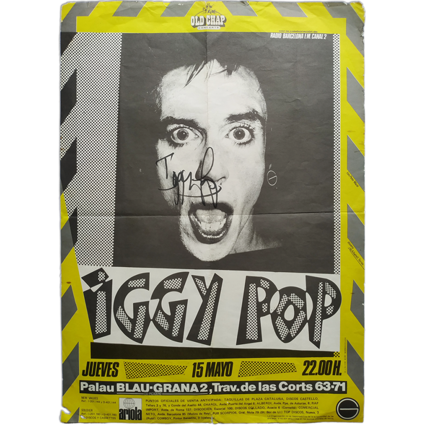 Cartel del concierto firmado a mano por Iggy Pop. Foto: Peter Mazel. Diseño: J. M. Albanell Torres. Pequeñas pérdidas y roturas en bordes