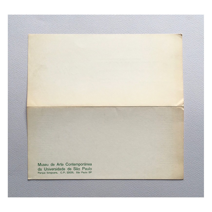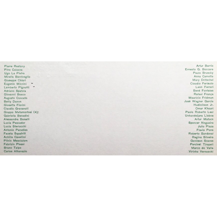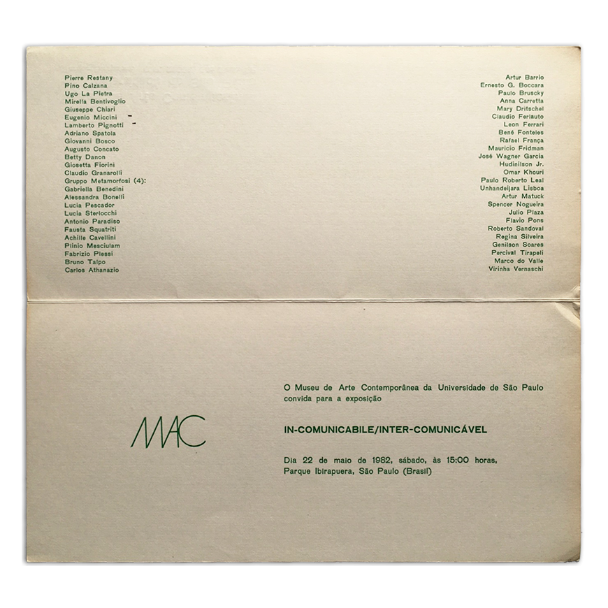 Díptico-invitación a la exposición. Incluye el listado de los artistas que participaron en la muestra, entre los cuales estaban Paulo Bruscky, León Ferrari, Julio Plaza, Regina Silveira, Artur Barrio, Pierre Restany, Ugo La Pietra, Mirella Bentivoglio, Adriano Spatola, Gruppo Metamorfosi, Achille Cavellini, Paulo Roberto Leal, Anna Carretta y muchos otros. El curador fue Wolfgang Pfeiffer