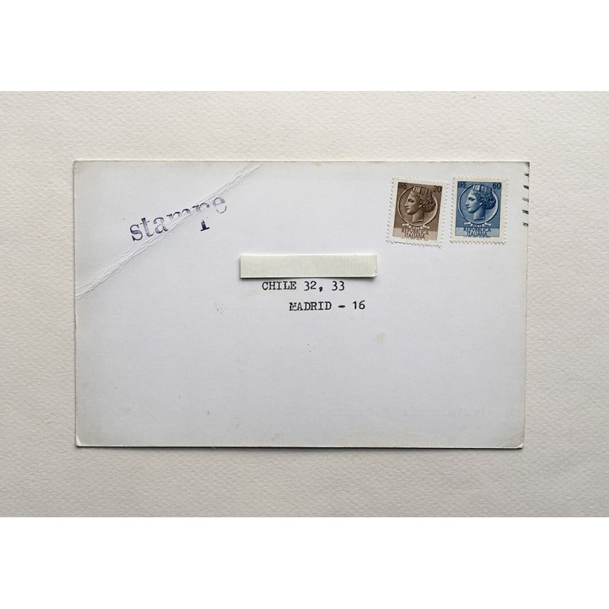 Tarjeta-invitación a la exposición. Con los datos del destinatario y matasellada. Marca de doblez