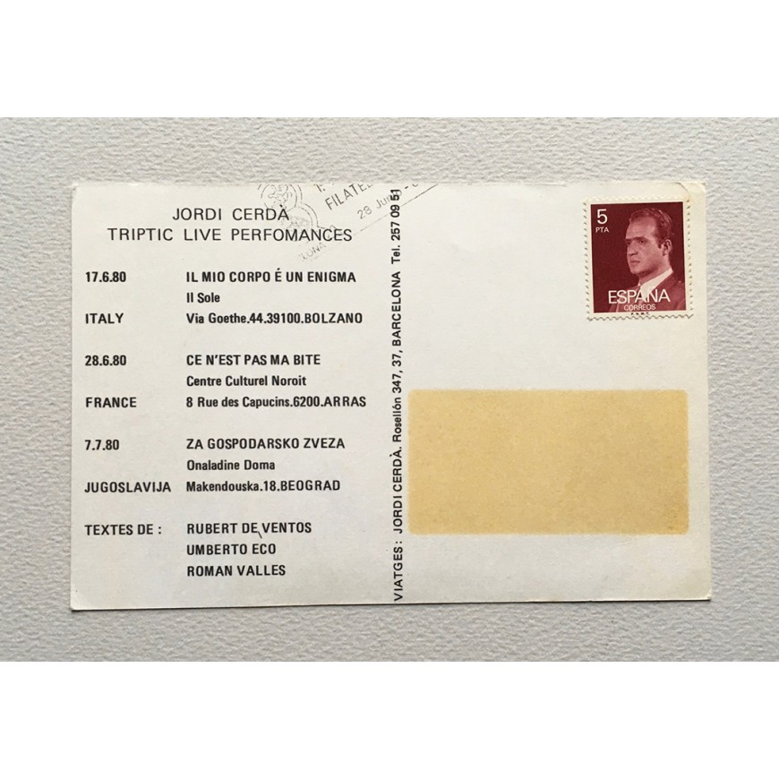 Tarjeta-invitación a tres performances de Jordi Cerdà ilustrada con uno de sus autorretratos: