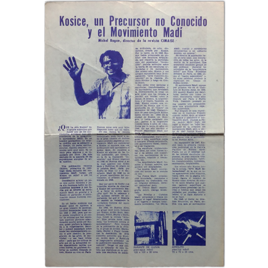 Artículo de Michel Ragon, director de la revista CIMAISE. En hoja suelta azul con ilustraciones e impresa por ambas caras