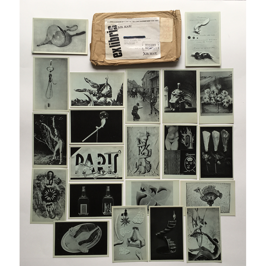 Set completo de 21 tarjetas sueltas en cartulina azulada. Reedición (¿de los años 70?), de la publicada por George Hugnet en Paris en 1937. En sobre postal remitido por la editorial Ex Libris a Division of T J Art Inc, 160A East 70th Street, New York; matasellado en noviembre de 1978