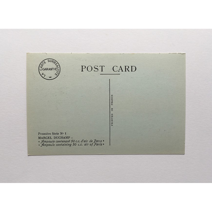 La carte surréaliste. Première Série: n°1-Marcel Duchamp-Ampoule contenant 5 c.c. d'air de Paris, n°2-André Breton-Poème Objet, n°3-Max Ernst-Le Triomphe de l'Amour, n°4-Paul Eluard-On tue comme on respire, n°5-Dora Maar-29, rue d'Astorg, n°6-Joan Miro-Horaire, n°7-Salvador Dali-La mélancolie gâteuse des chiens comme une vertigineuse descente en ski, n°8-Hans Bellmer-Deux demi-soeurs, n°9-Man Ray-Ce qui nous manque à tous, n°10-Yves Tanguy-Le marchand de sable, n°11-Oscar Dominguez-Ouverture, n°12-Hans Arp-Côté à ouvrir, n°13-Georges Hugnet-Au pied de la Lettre, n°14-Meret Oppenheim-Ma Gouvernante, n°15-René Magritte-La solution du rébus, n°16-Jacqueline BReton-Pont du demi-sommeil, n°17-Roland Penrose-La Terre en bouteille, n°18-Marcel Jean-Paris à vol d'oiseaun°19-Wolfgang Paalen-A l'échelle du désir, n°20-Nusch Eluard-Bois des Iles et n°21-Pablo Picasso-Poisson d'Avril