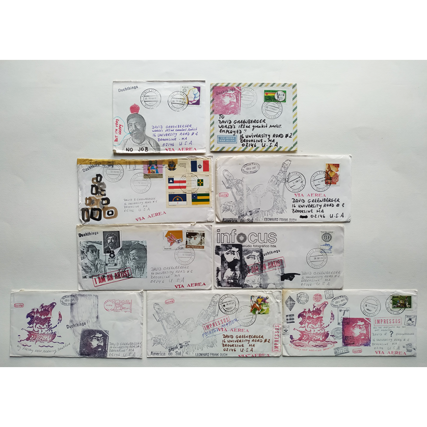 Conjunto del 9 cartas del "mailartista" germano-brasileño Leonhard Frank Duch. Todas ellas dirigidas desde Recife (Brasil) al artista norteamericano David Greenberger entre los años 1981 y 1983. Con los sobres postales. Utiliza la fotocopia, el collage, los sellos de goma, etc