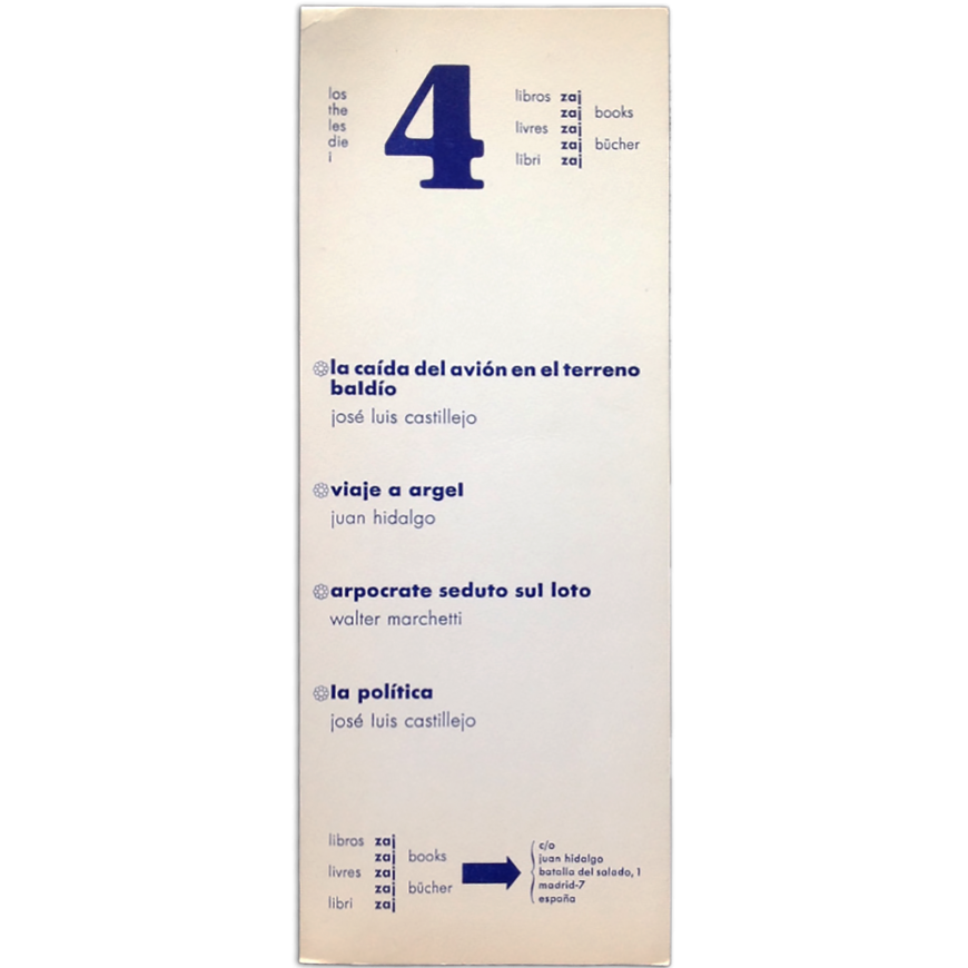 Los 4 libros zaj. La caída del avión en el terreno baldío, José Luis Castillejo - Viaje a Argel, Juan Hidalgo - Arpocrate seduto sul loto, Walter Marchetti - La política, José Luis Castillejo