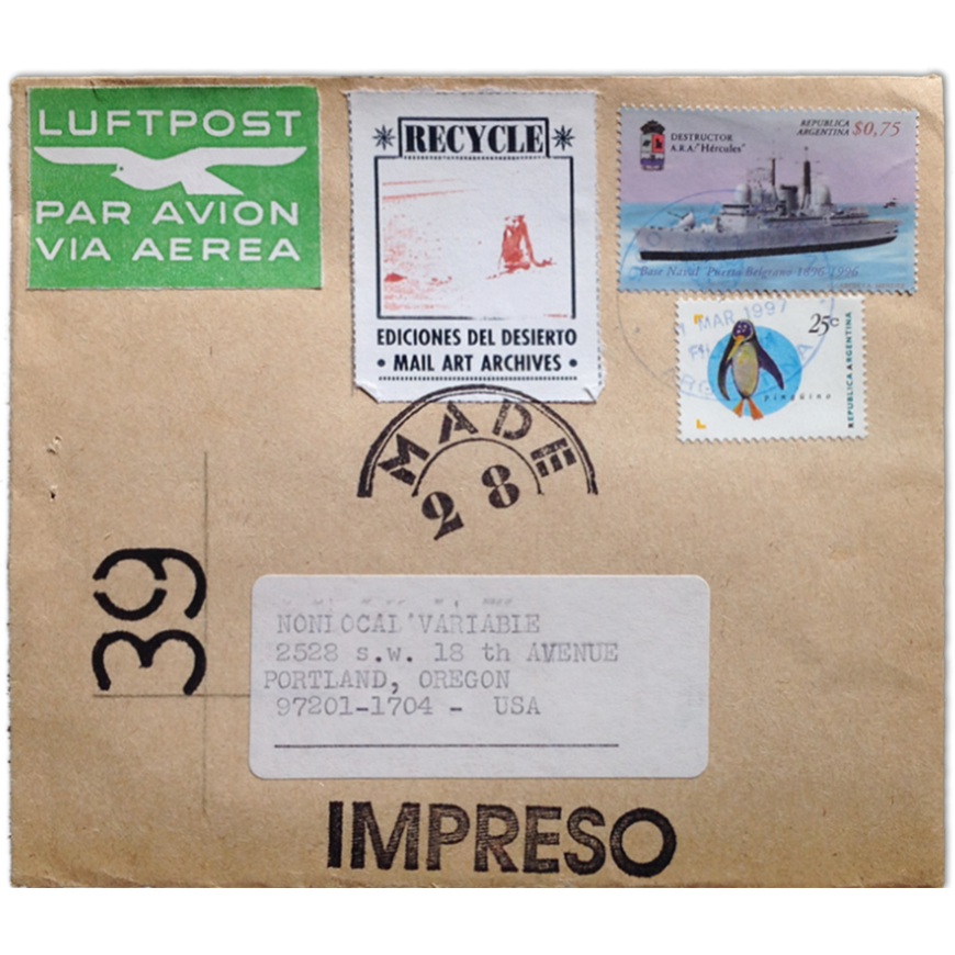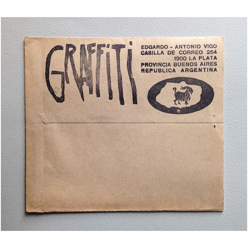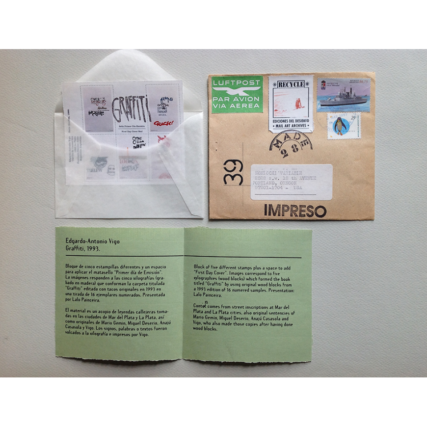 Sobre postal con diversos sellos de papel y de goma de Vigo. Dentro 2 hojas sueltas impresas: una con 5 estampillas de la "Serie Graffiti, 1993" y un pliego de dos hojas con un texto de Vigo en español e inglés ("Graffiti, 1993"). Expedido el 1 de Marzo de 1997 desde La Plata, Argentina y dirigido a "Nonlocal Variable" en Portland, Oregon