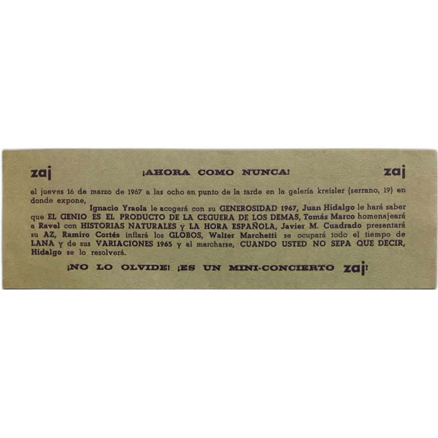 Zaj ¡ahora como nunca! Zaj - ¡No lo olvide! ¡Es un mini-concierto zaj!. Galería Kreisler, [Madrid], 16 de marzo de 1967