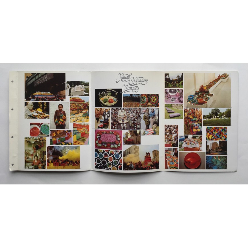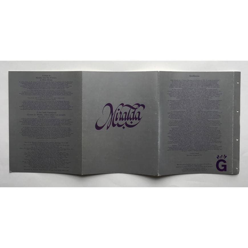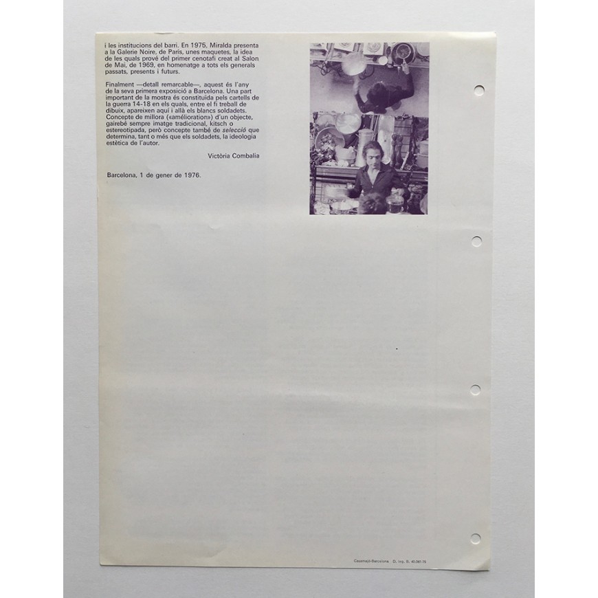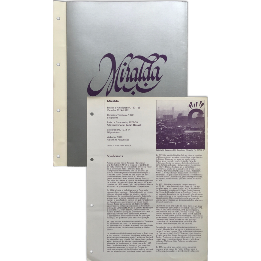 Hoja informativa de la galería con fotografía en b/n y texto de Victoria Combalía. Impresa por ambas caras. Se adjunta un "menú" editado por la galería con motivo de la muestra, con fotografías en color y semblanza por Victoria Combalía. Primera exposición de Antoni Miralda en Barcelona. En catalán