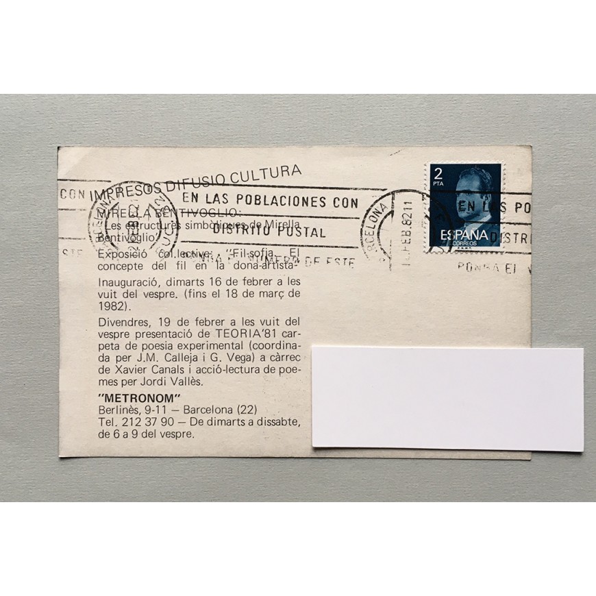 Tarjeta-invitación a la exposición. Sello postal matasellado y etiqueta adhesiva con los datos del destinatario. En la invitación de anuncia también, para el 19 de febrero, la presentación en la galería de la carpeta de poesía experimental "Teoría '81" (coordinada por J. M. Calleja y G. Vega) a cargo de Xavier Canals y con acción-lectura de poemas de Jordi Vallès. En catalán