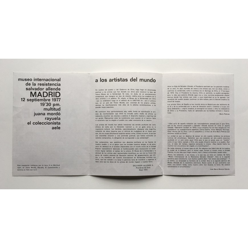 Tríptico con la lista de todos los artistas que participaron en la exposición y textos de Salvador Allende y José María Moreno Galván. Pequeña rotura en borde inferior, por lo demás buen estado