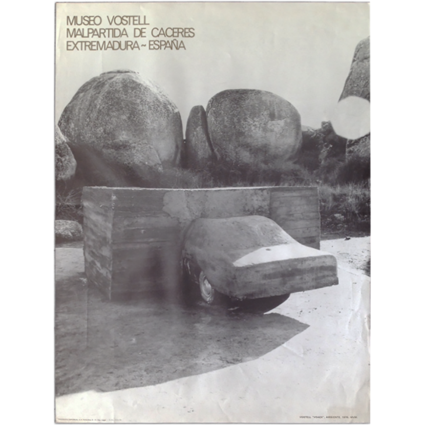 "En octubre de 1976 ocurren, por fin, los dos acontecimientos que pondrían oficialmente en marcha el Museo: por una parte, el Ayuntamiento firma un contrato con el artista por el cual se acuerda "dedicar los terrenos necesarios en la finca de Los Barruecos y la obra de fábrica del Lavadero para la instalación de un museo de arte contemporáneo que se denominará Museo Vostell Malpartida". Y por otra, el 30 de octubre, se inaugura la primera escultura-ambiente de Vostell en Los Barruecos: "VOAEX", un coche empotrado en hormigón situado al pie de las emblemáticas Peñas del Tesoro, que sería desencofrado en un acto muy ritual ante la expectante mirada de muchos vecinos mezclados con profesores de arte, coleccionistas, historiadores y artistas de varios países europeos, todos ellos, aglutinados en torno a Vostell bajo un espíritu de mezcla, intercambio, creatividad y libertad, que sería el santo y seña del Museo"