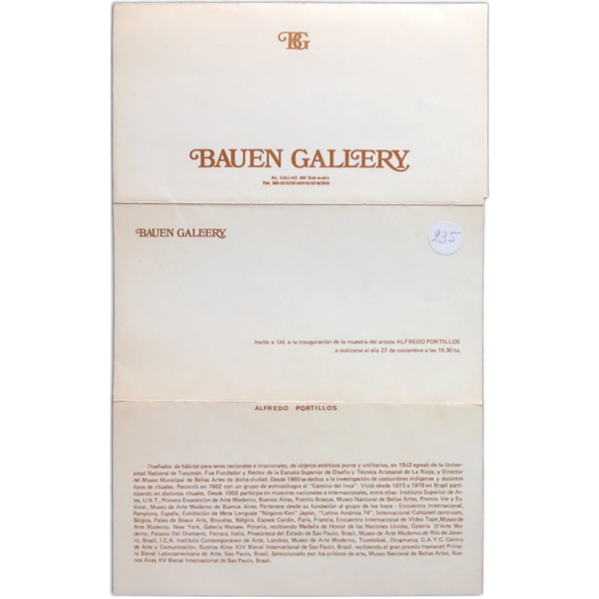 Folleto-invitación a la exposición con texto de Jorge Glusberg ("Apropiación y transgresión de Alfredo Portillos). Pequeña etiqueta adhesiva