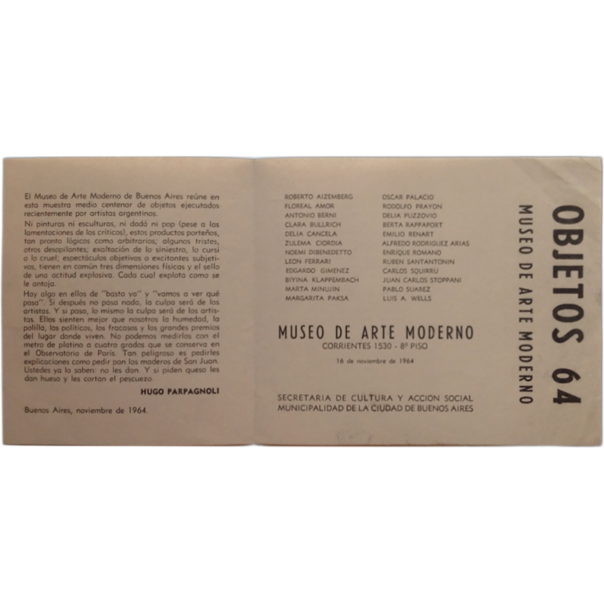 Folleto de la exposición con texto de Hugo Parpagnoli. La muestra reunió medio centenar de objetos realizados por artistas argentinos del momento como Roberto Aizemberg, Antonio Berni, León Ferrari, Marta Minujín, Carlos Squirru, Edgardo Giménez, Oscar Palacio, Emilio Renart, Enrique Romano, Pablo Suárez y otros